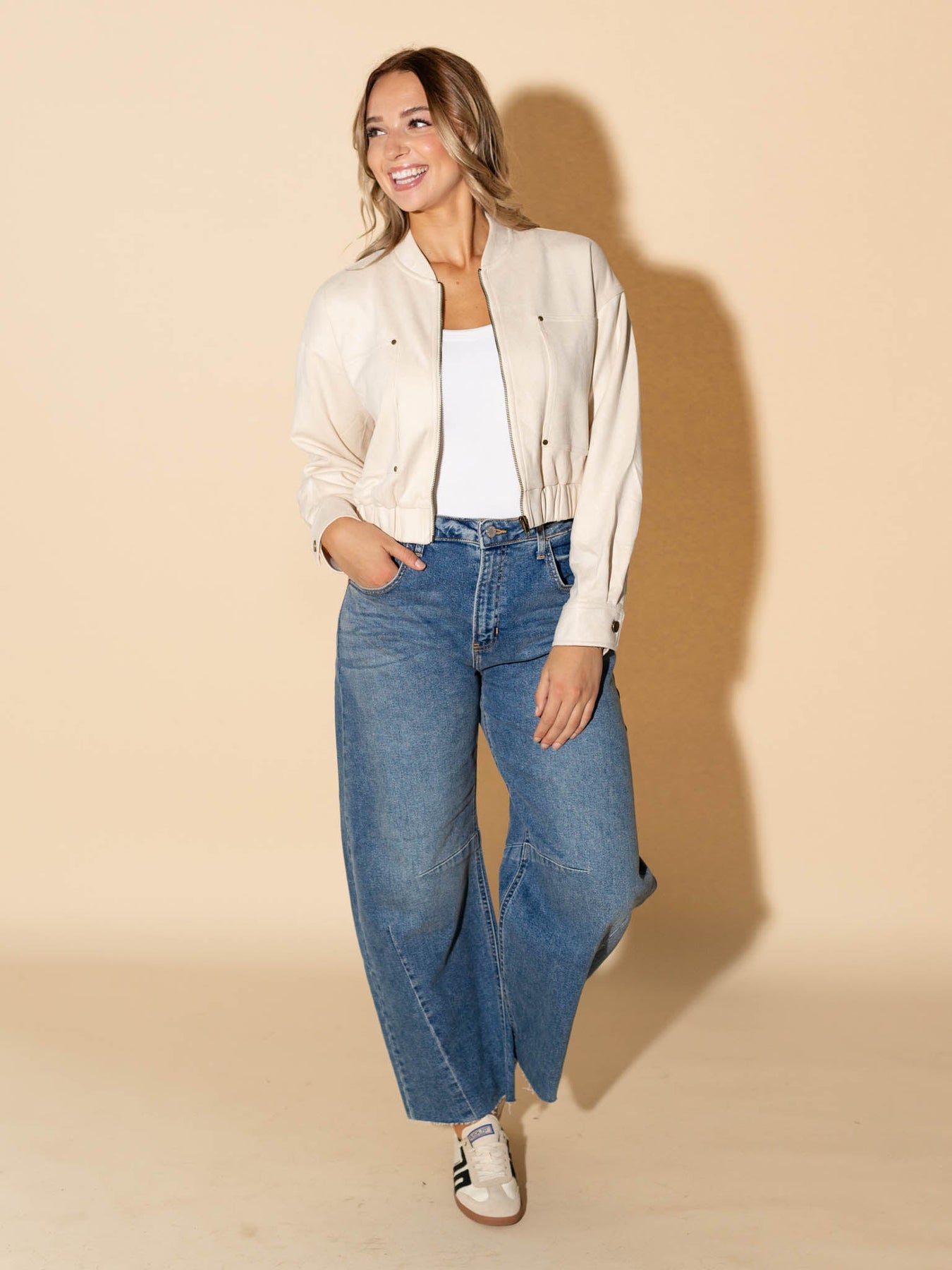 Ivory Jacket has been styled with Just Black Medium Denim Seam Detail Barrel Jean
