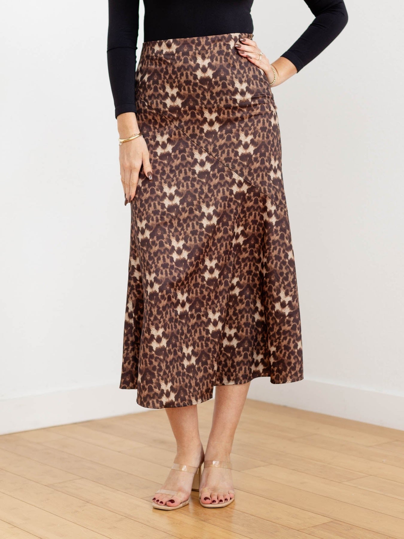 Slip into statement-making style with this leopard midi skirt that refuses to blend in. Crafted from luxuriously silky satin, it drapes with effortless flow while a bold piecing seam design adds architectural flair. The voluminous silhouette jets out dramatically for that fun, flirty vibe that turns heads.
