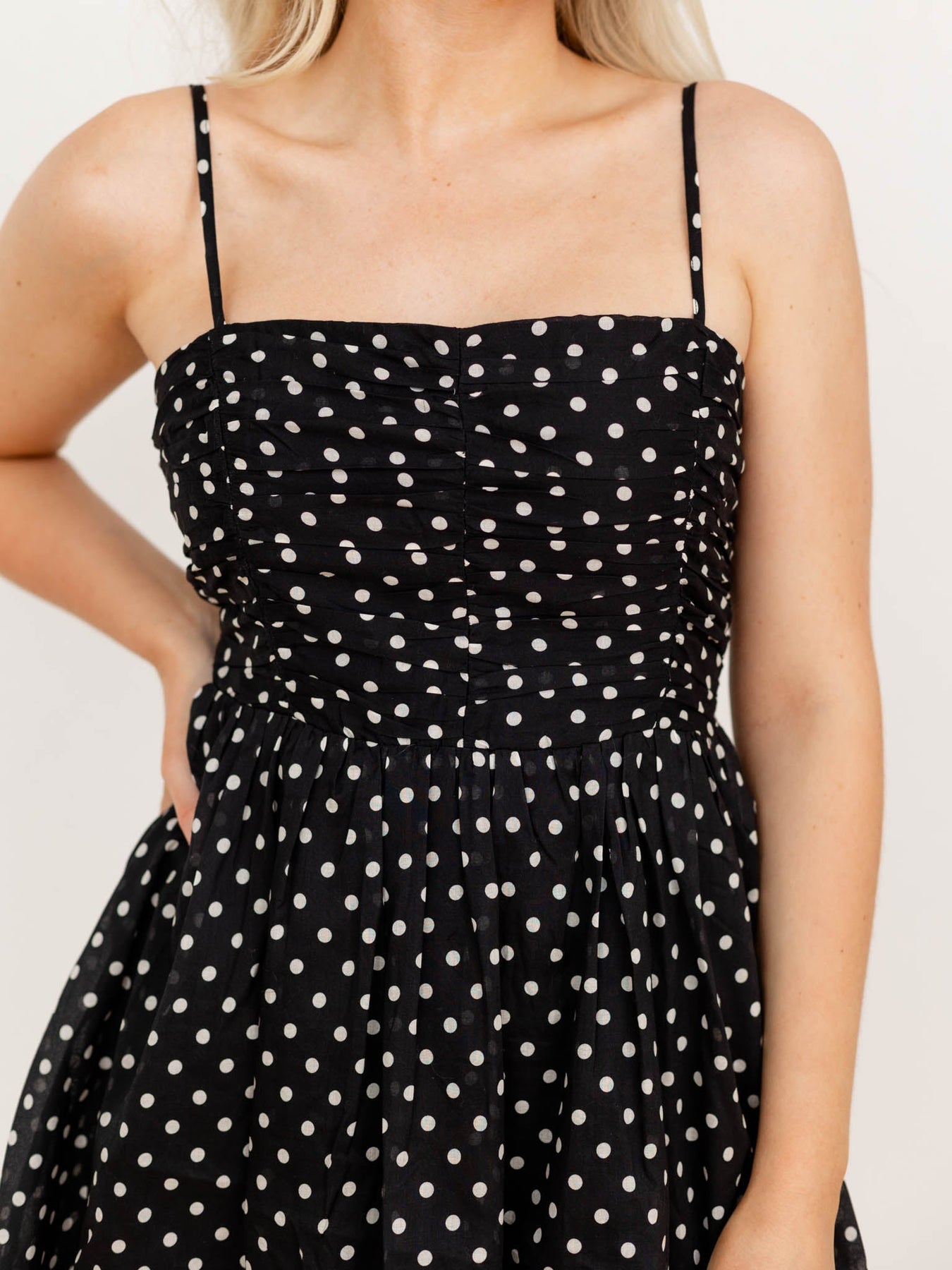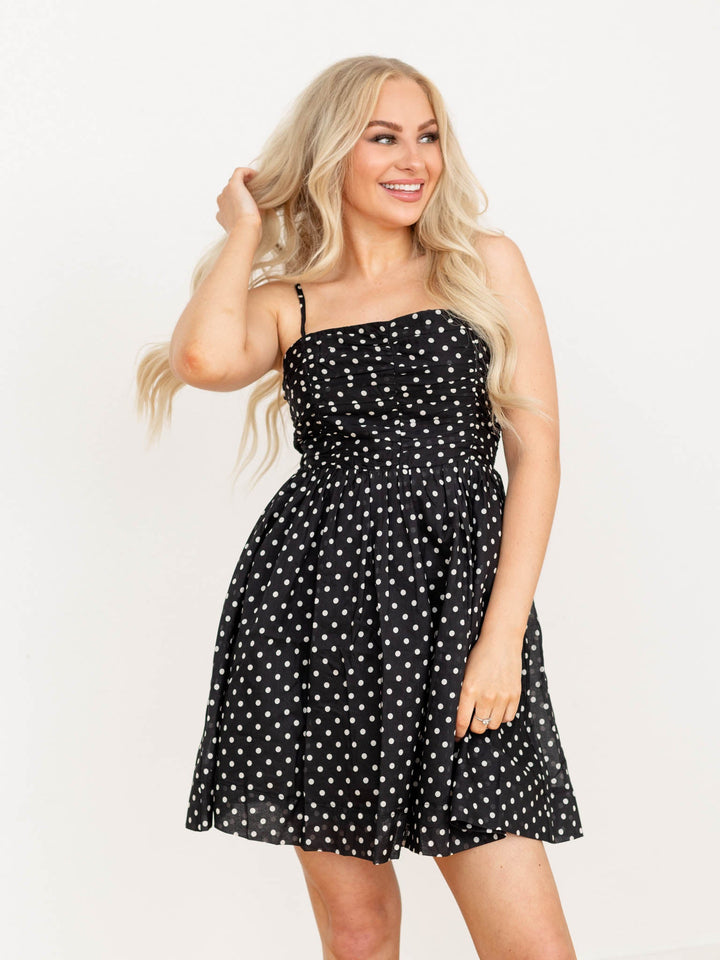 Step into playful charm with this new arrival from PINCH. Featuring a retro-inspired polka dot pattern and a ruched, gathered bodice, this mini dress offers a fun and flirty vibe perfect for dressing up or down. Its flattering silhouette and lively design make it an effortless choice for any occasion.