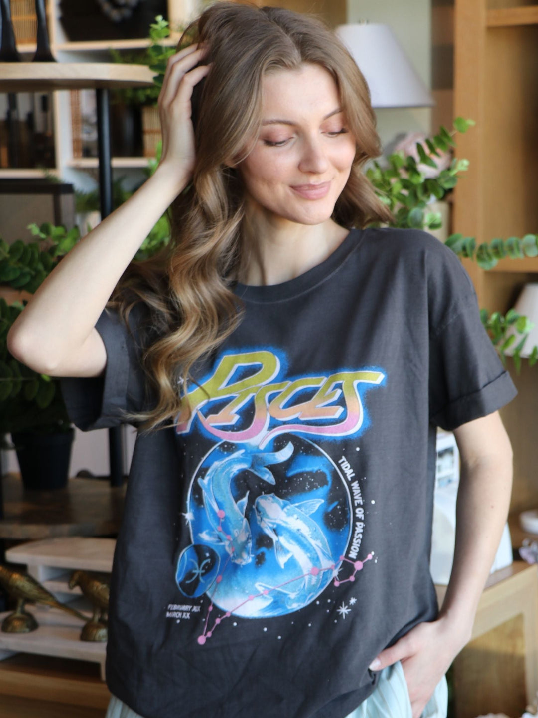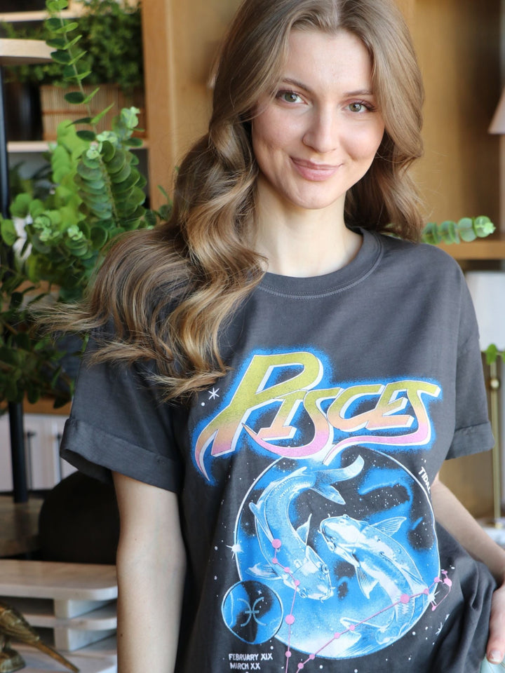 Trending big for the season at hand, this tee features an Pisces astrology sign in a vintage inspired graphic featured throughout a washed + cuffed short sleeve tee body. Effortlessly cool and casual for a trending look this season.