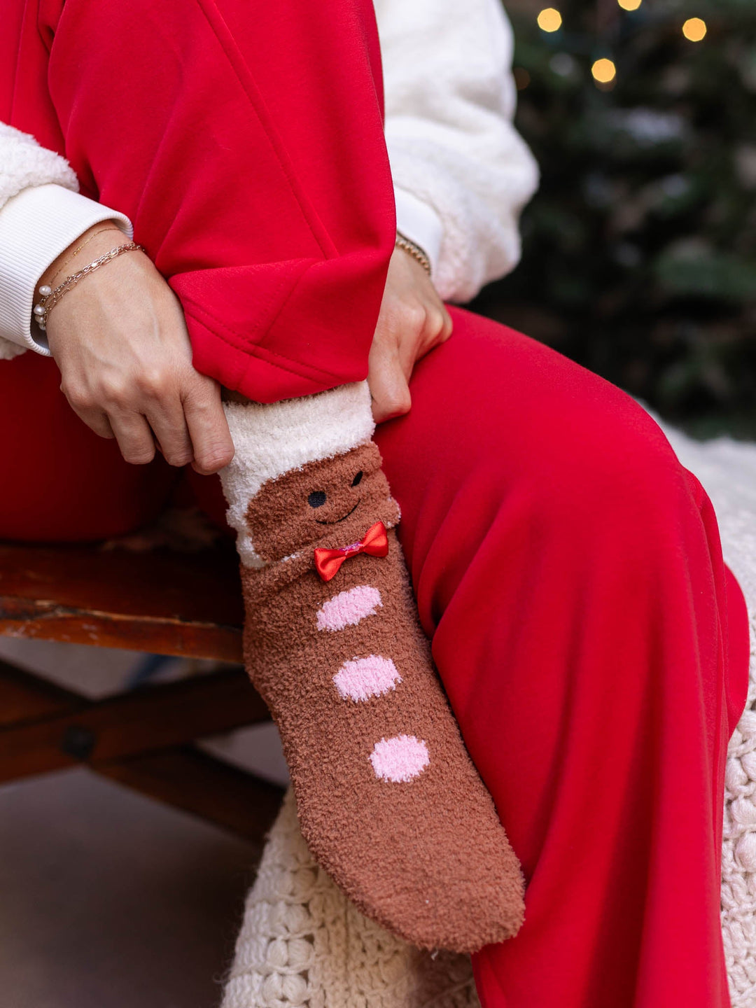 A super fuzzy and soft sock features a playful gingerbread design for a fun and festive addition to your cozy holiday look!