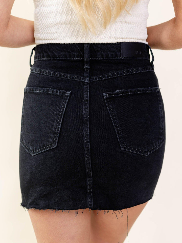 This black denim skirt features a button front closure for a fun + casual way to update this edgy inspired look. Feeling cool and casual, a raw hemline adds to the overal casual look and feel. Perfect for the festival and concert season at hand!