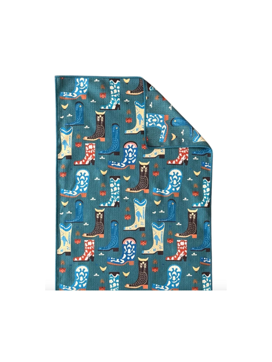 This double sided hand towel features an Americana + western inspired cowboy boot design throughout. A fun way to add a pop of color and style into your home.