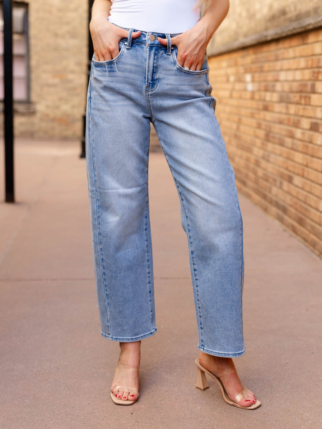 Elevate your style with these totally trending denim. These trend forward denim pants feature a unique side seam accent and a relaxed, slightly baggy appearance. The medium wash adds a casual yet chic touch. Enjoy the comfort and fashion-forward look with the hottest barrel style.