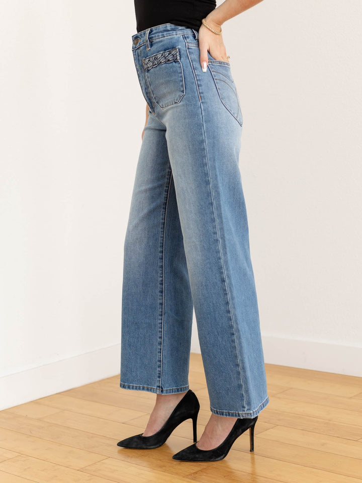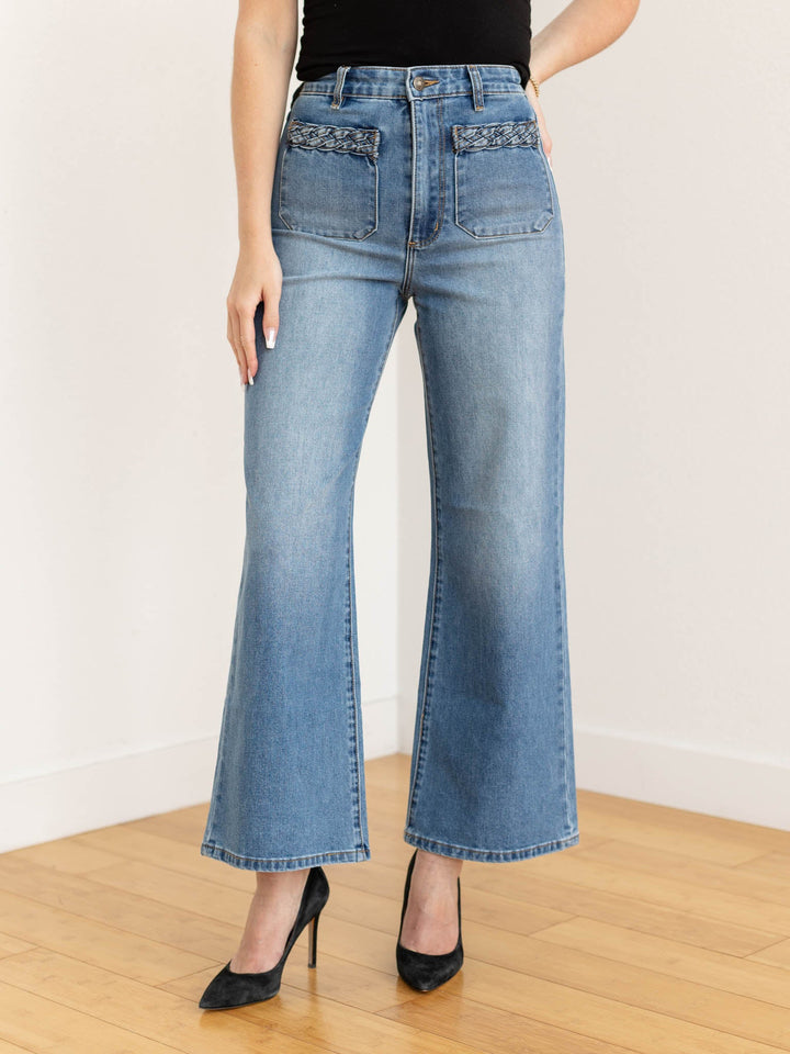 Add an update to your denim collection with this new arrival from Rollas! We love how the front patch pocket has been updated even further with a chunky braided detail - a fun go-to look this spring and summer season. A wide leg that flares out creates a bold style statement for a trend forward look this season.