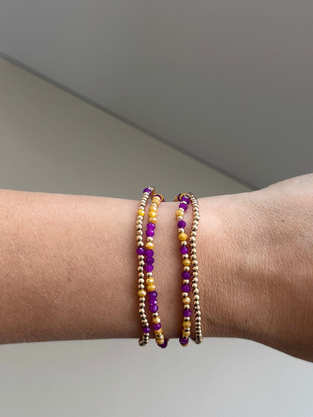A set of 4 dainty beaded stretchy bracelets feature a pop of yellow + purple to add style and flair to any game day look.