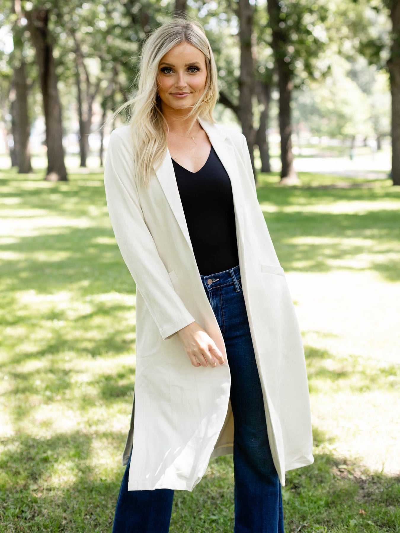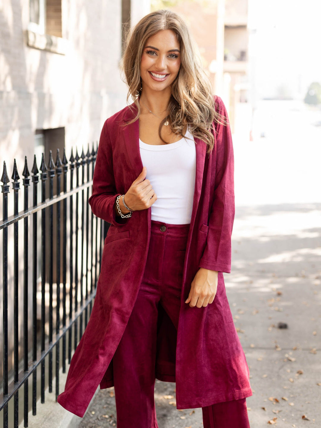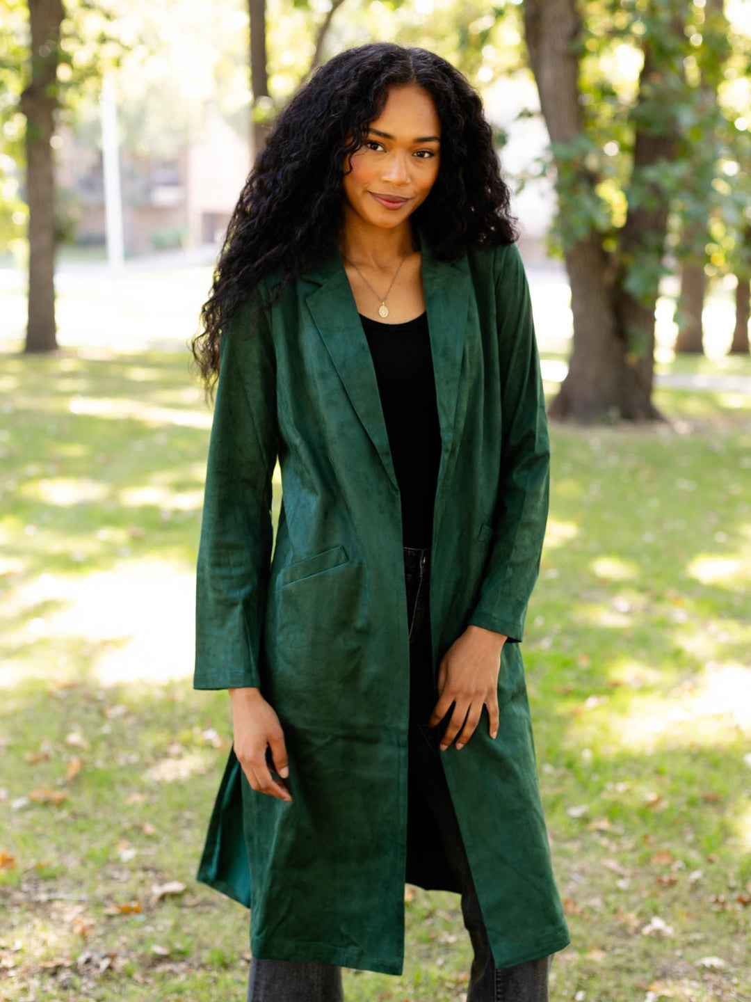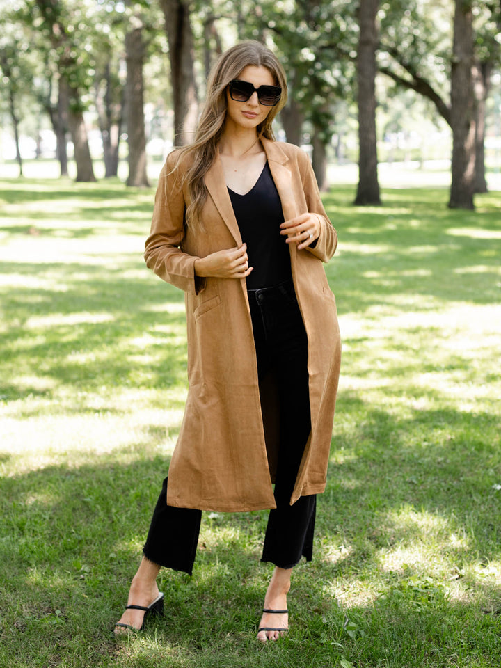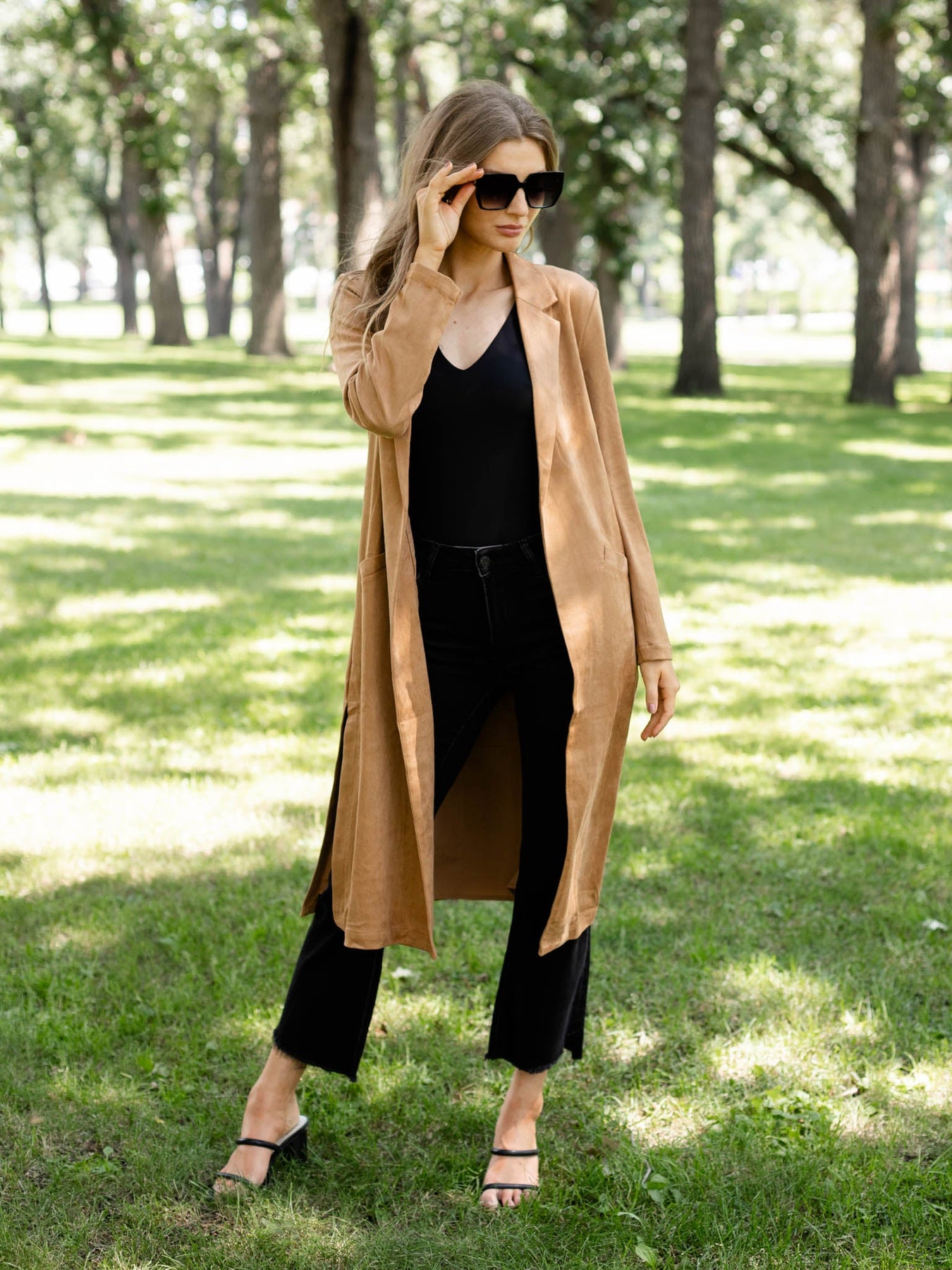 Wrap yourself in the playful charm of this new arrival. Crafted from soft faux suede, this duster features a relaxed, flowy fit with a breezy open front and stylish side slits. The collared neckline adds a touch of sophistication, while the duster length gives you effortless coverage and movement. Perfect for layering with a hint of casual elegance!