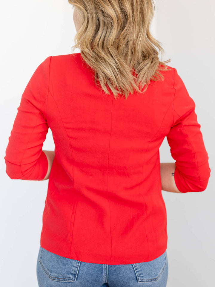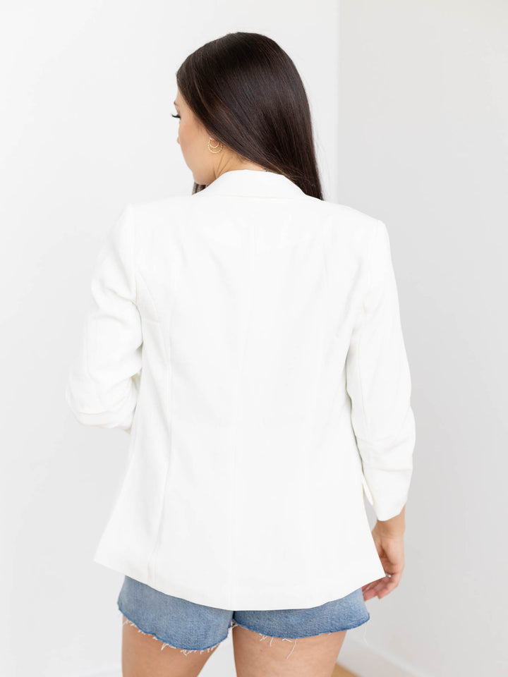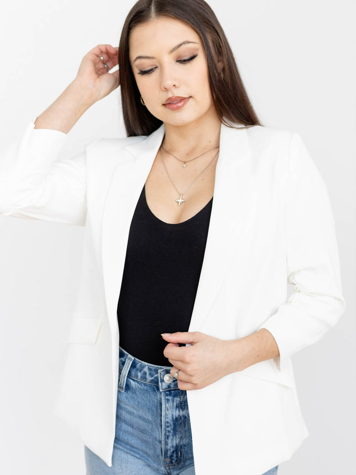 A blazer is a style staple that will stand the the test of time. This new arrival featurees a more comfortable approach to this traditional style thanks to the relaxed woven fabrication and the gathered, shirred sleeve detail. The open front design and pocket accents add a slightly more casual touch to the look - allowing this to be styled for work or play with ease!