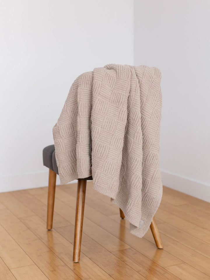 This SUPER SOFT blanket features a solid coloration mixed with a textured, checkered print inspired design throughout. Curl up in comfort + style all winter long with this new arrival.