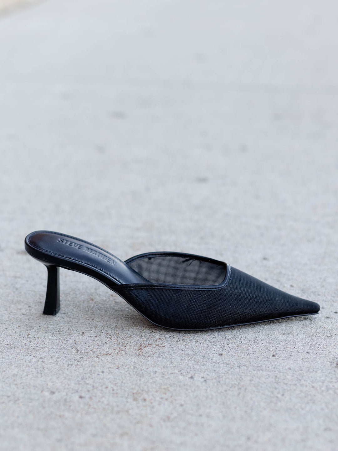 A sleek and simple slip on mule heel, this look by Steve Madden features a mesh fabrication for a flirty finish that is trending this season.