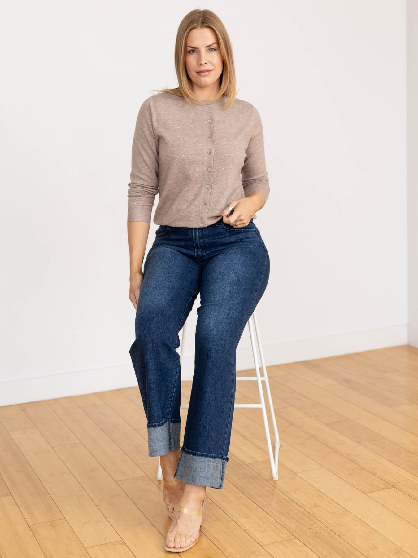 Cardigan has been styled with Just Black Dark Denim Cuffed Wide Leg