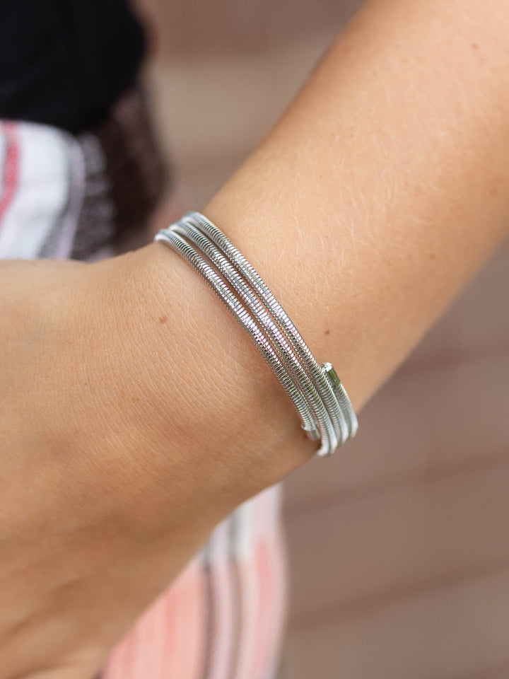 This coiled bracelet features a stretchy silhouette to fit onto your hand perfectly. A great look to stack on to complete any outfit.