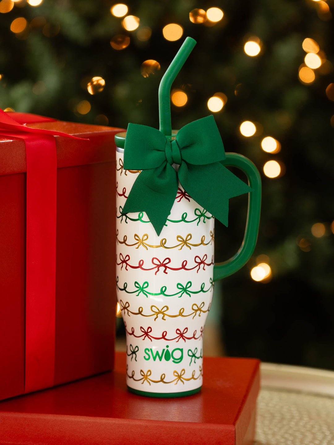 This large style mug features a straw detail and side handle with a festive bow printed design for the holiday season.