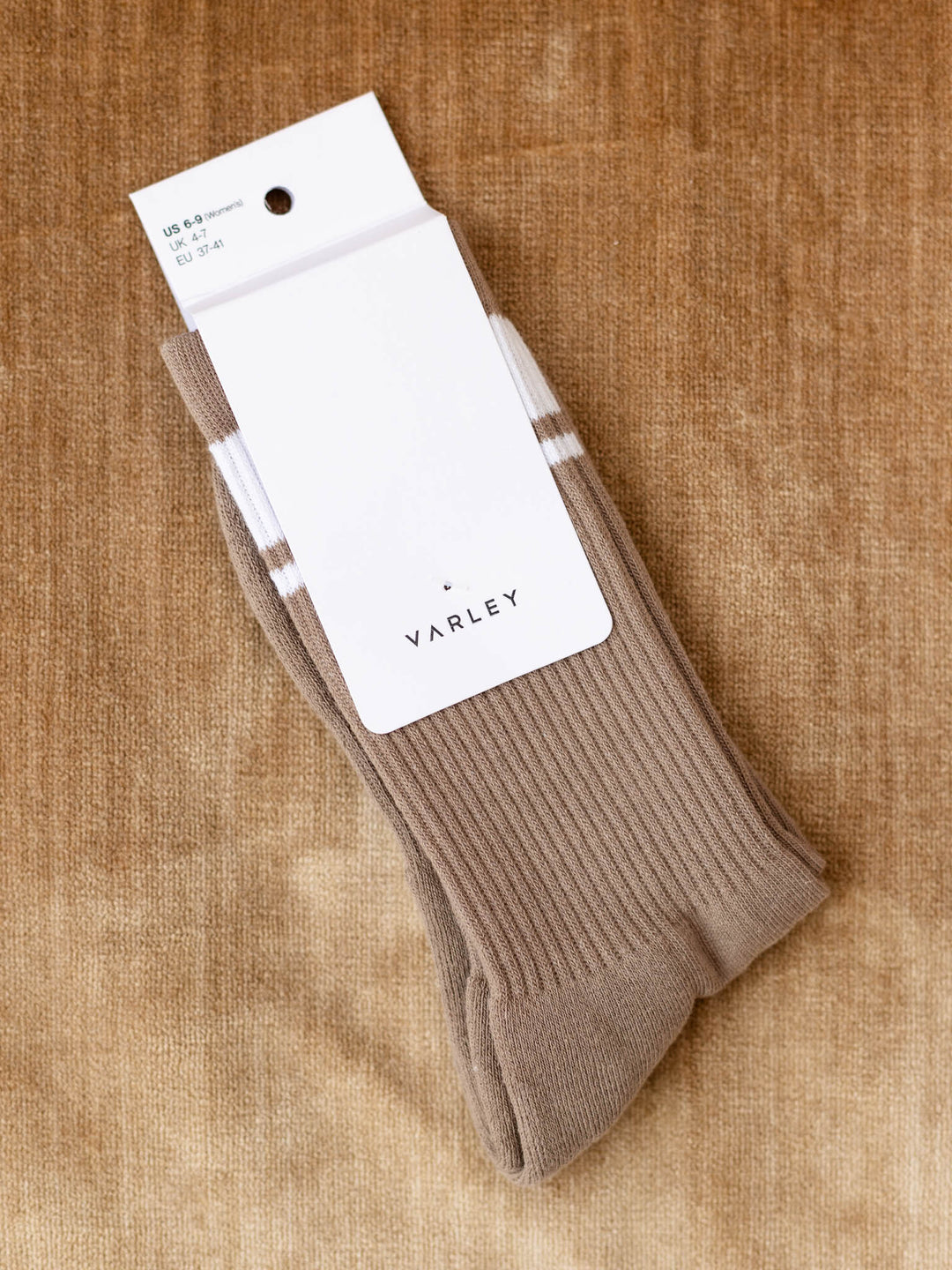 A classic, retro inspired tube sock with the athleisure, preppy chic inspired stripe design features a feminine embroidered Varley across the top. Easy and effortlessly chic while perfectly casual for everyday wear.