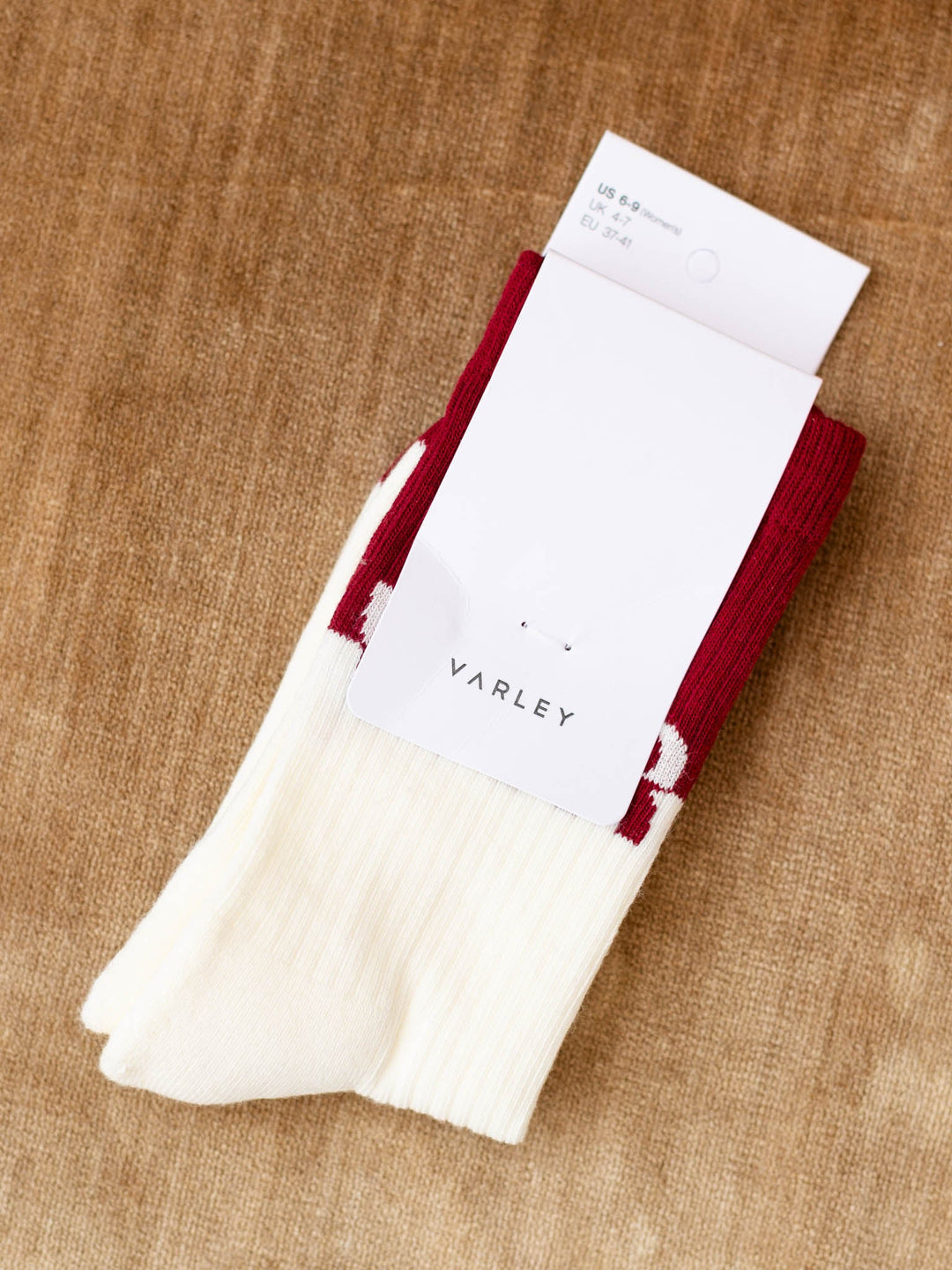A tube style sock features a contrasting two tone stretchy design with VARLEY across the mid of the sock. Athleisure inspired with a chic twist.